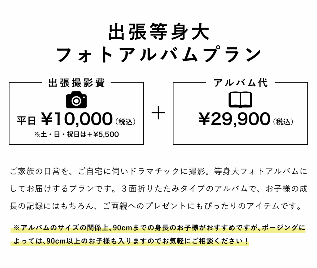 等身大アルバムは、ただプレゼントするためのものでなく、お客様自身も”撮影してもらう”という体験をすることができます。なかなか子どもと一緒に写っている写真がない!、家族全員が写っている写真がない!という方はこの機会にぜひ!