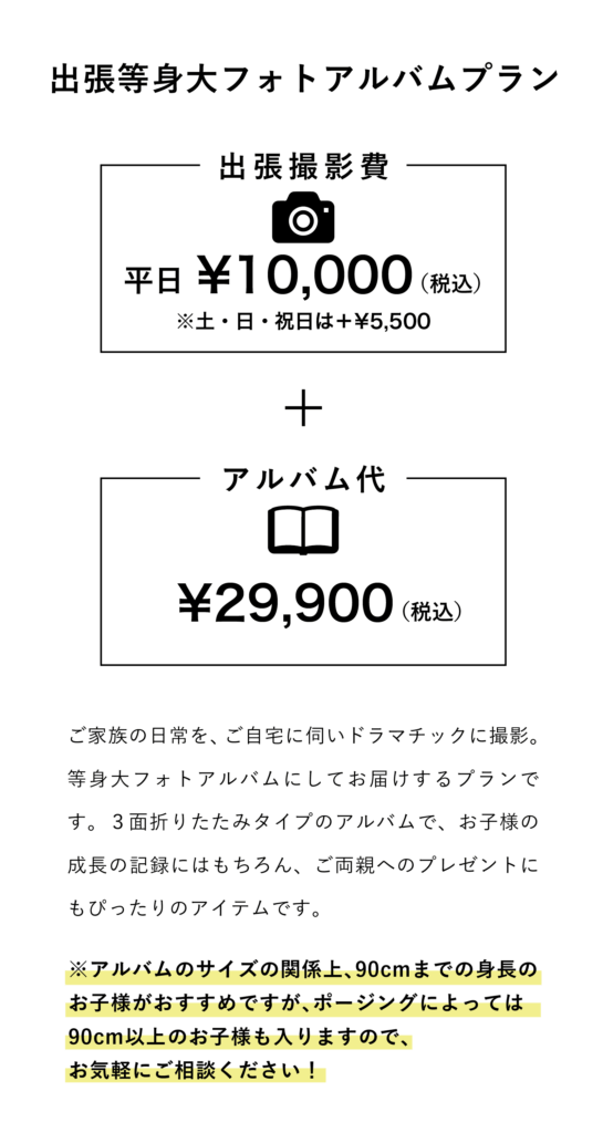 通常は90cm以内のお子様が対象の商品ですが、より多くの皆様に等身大アルバムを楽しんでいただくため、Tokyo My Storyではポージングを工夫して90cm以上のお子様の撮影やご兄弟での撮影も承っております。まずはお気軽にご相談ください。